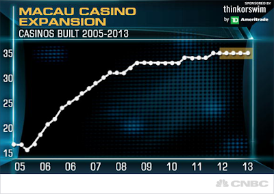 3) Leverage makes this highly explosive. There is operating leverage for Casinos as a whole - most costs are highly fixed in building the resort, games etc., so once a casino is built every new customer is profit (roughly). This means that when there is a flood of big gamblers from say China, casinos do well (see above graph).